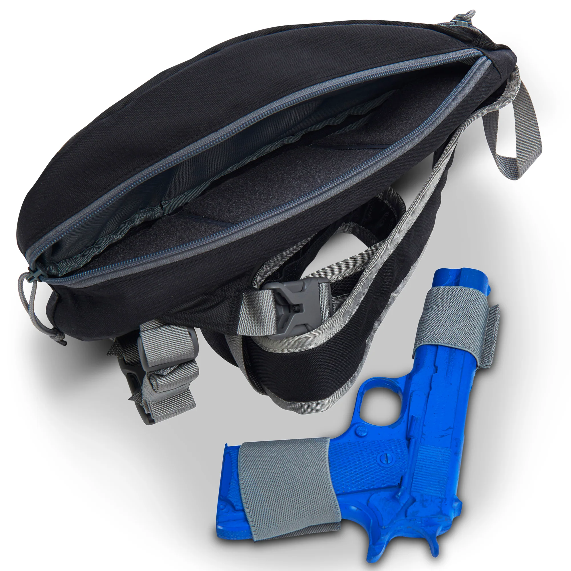 Designed to be worn across the chest, the Sling Bag offers quick, efficient access to internal storage. The main compartment has a rigid back with loop-sided Velcro, allowing the user to customize the bag with any hook-sided accessory. Available in left or right hand versions, the Sling bag fits the user’s holster and two clip holders. Choose the Left or Right version according to your predominate hand, i.e., a left-handed shooter would use the Left sling, worn on the right shoulder, for easy access to the weapon.